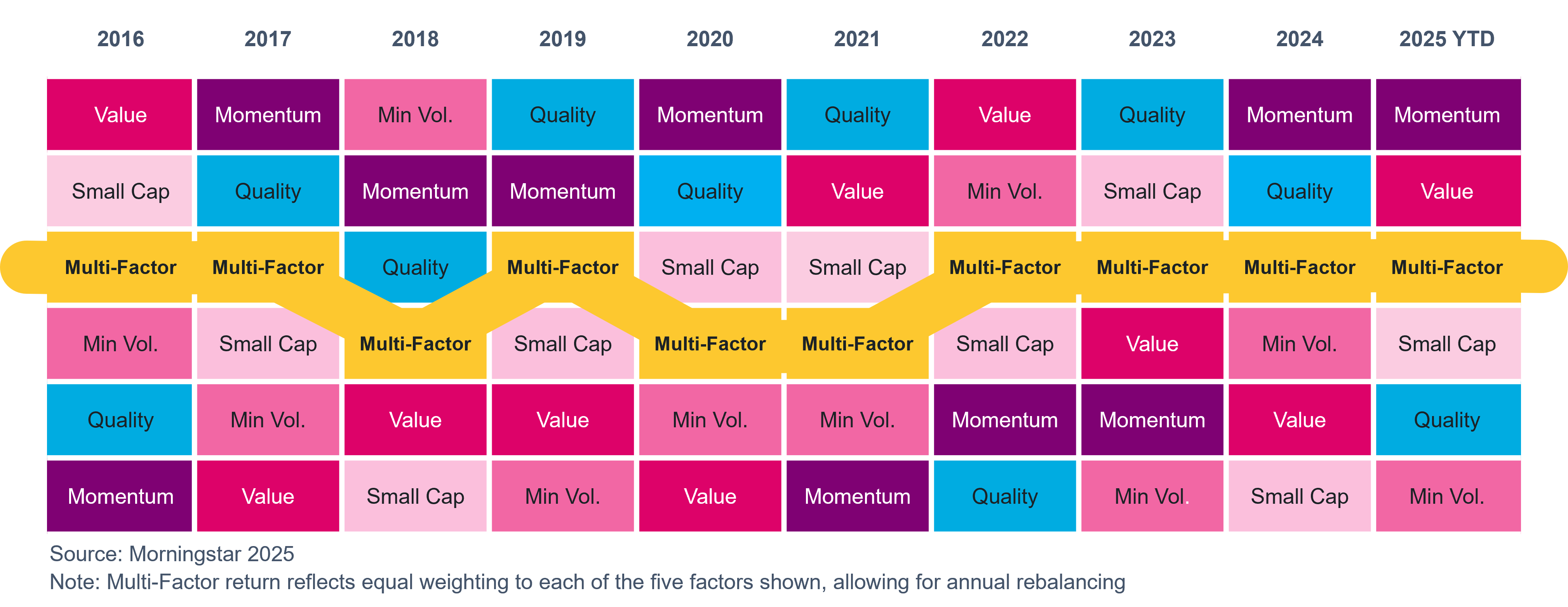 Why it matters: It can smooth the investment journey for clients and help advisers deliver on long-term planning goals. We demonstrate the smoothing effect in the chart below, where a ‘Multi-Factor’ approach performs more predictably and consistently than individual factors which can be more volatile.